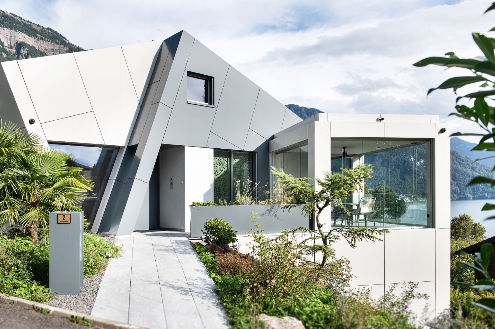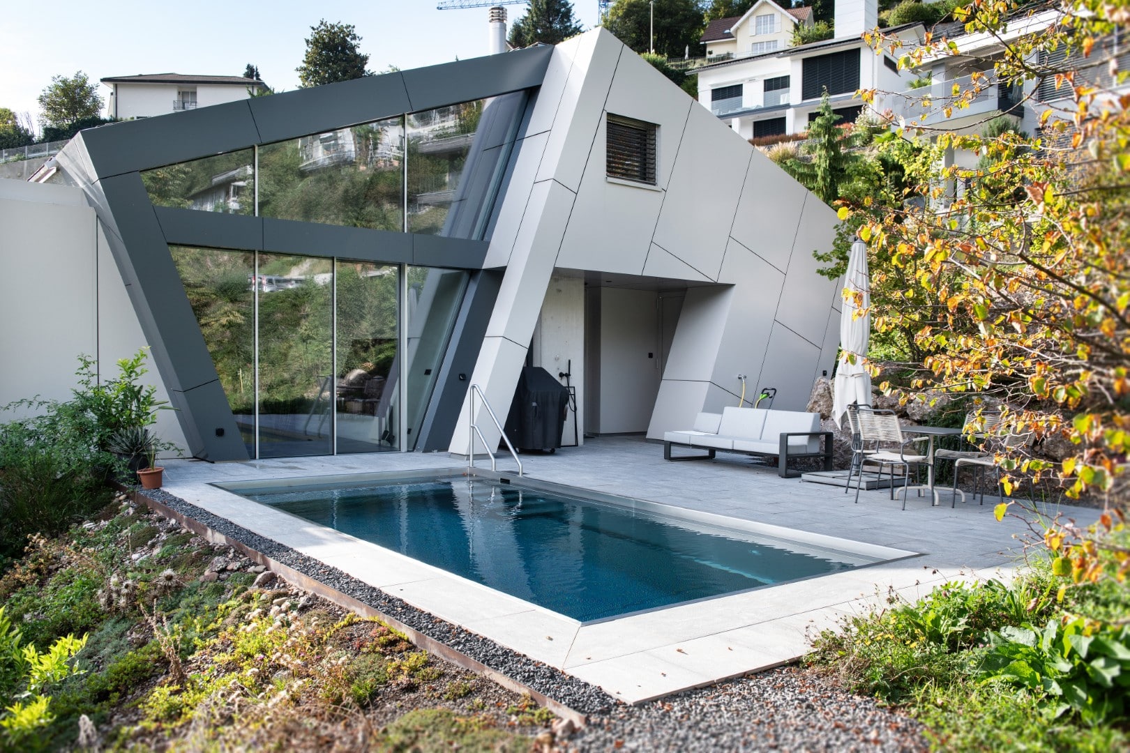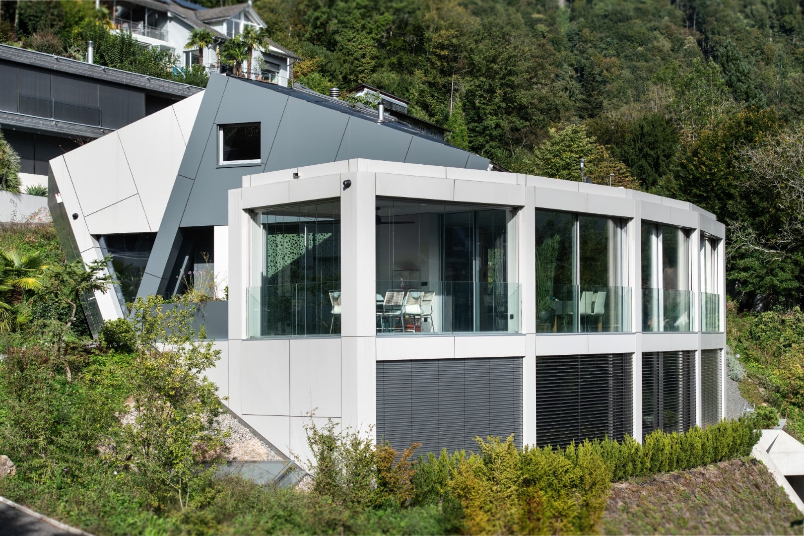 Gestaltungsvorschriften umsetzen, Einzigartigkeit bewahren. Die Satteldachvorschrift wurde unter Beachtung der Geländestruktur erfüllt, die entstehenden Schrägen in die konstruktive und statische Umsetzung übernommen. So entstanden Raumkonstellationen, die aus unterschiedlichen Blickwinkeln immer wieder faszinieren.