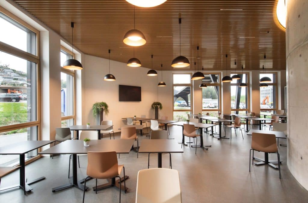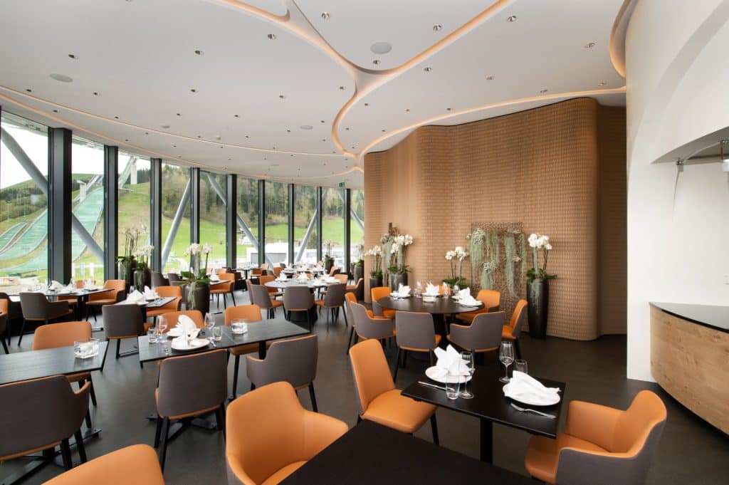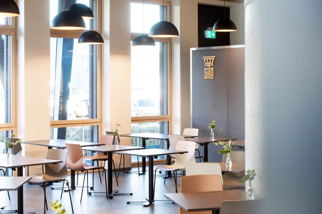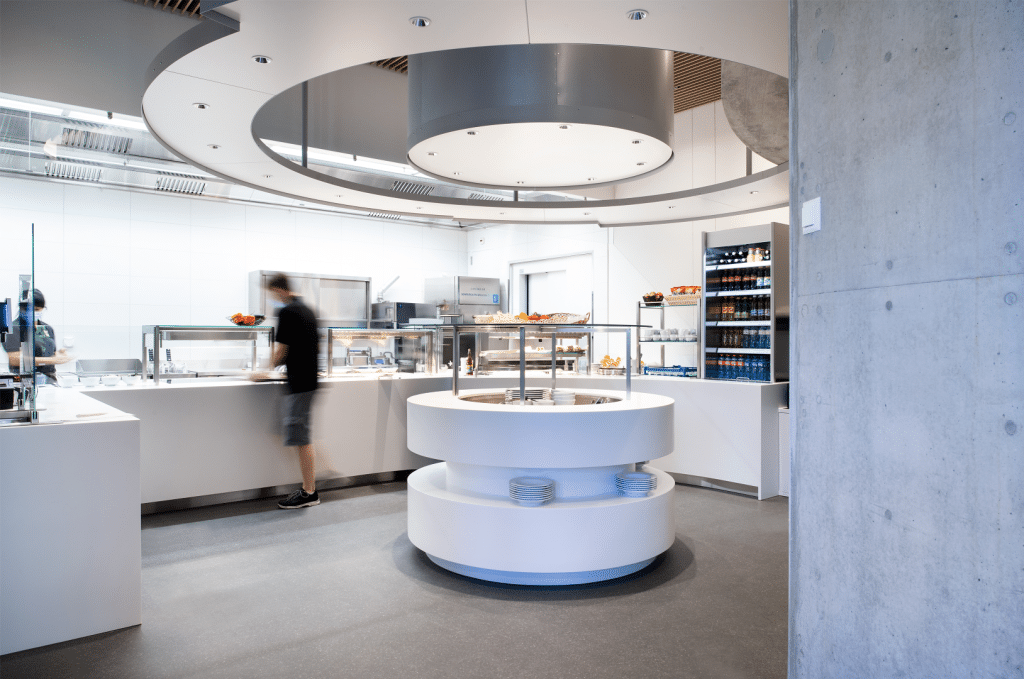 Der Wunsch nach Verpflegungsmöglichkeiten für Betriebsangehörige, Kunden und Gäste führte zur Umnutzung und Aufstockung einer alten Siloanlage. Die vielseitige Formensprache des Panorama-Restaurants, der Lounge und der Kantine, gepaart mit ausgefeilter Akustik, überzeugt die Gäste und sorgt für ein angenehmes Ambiente.