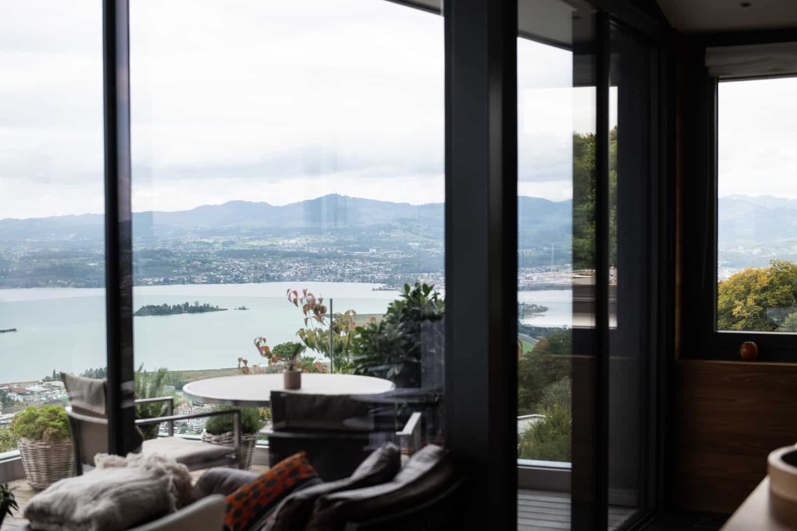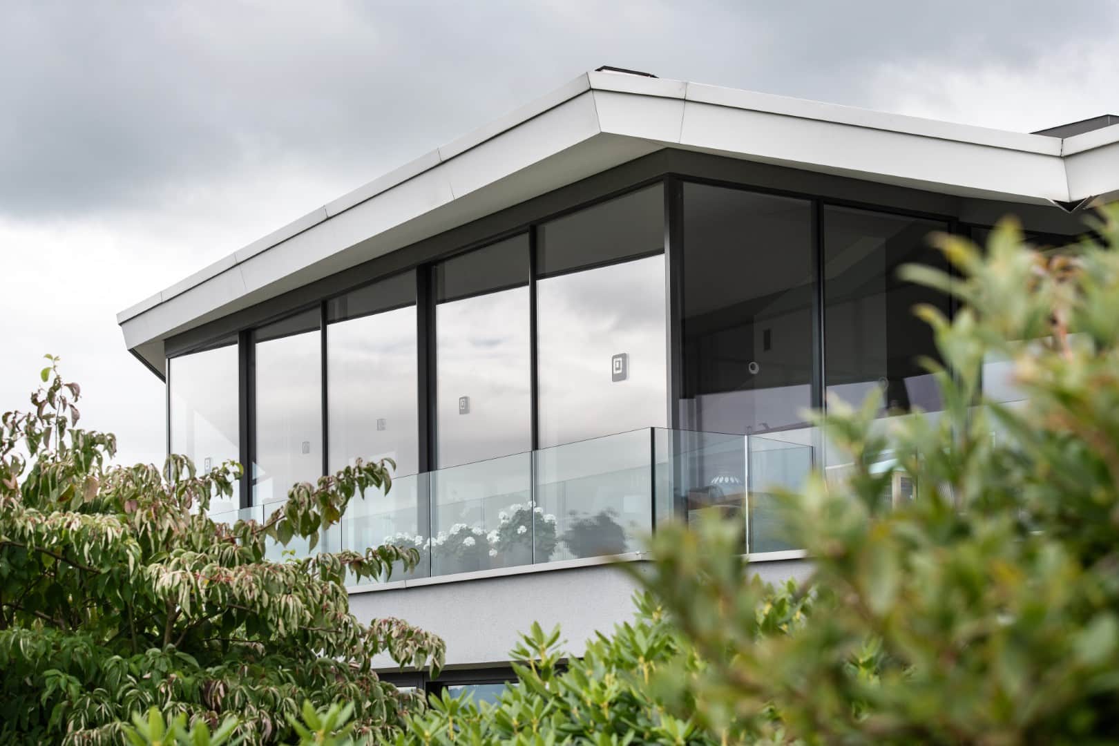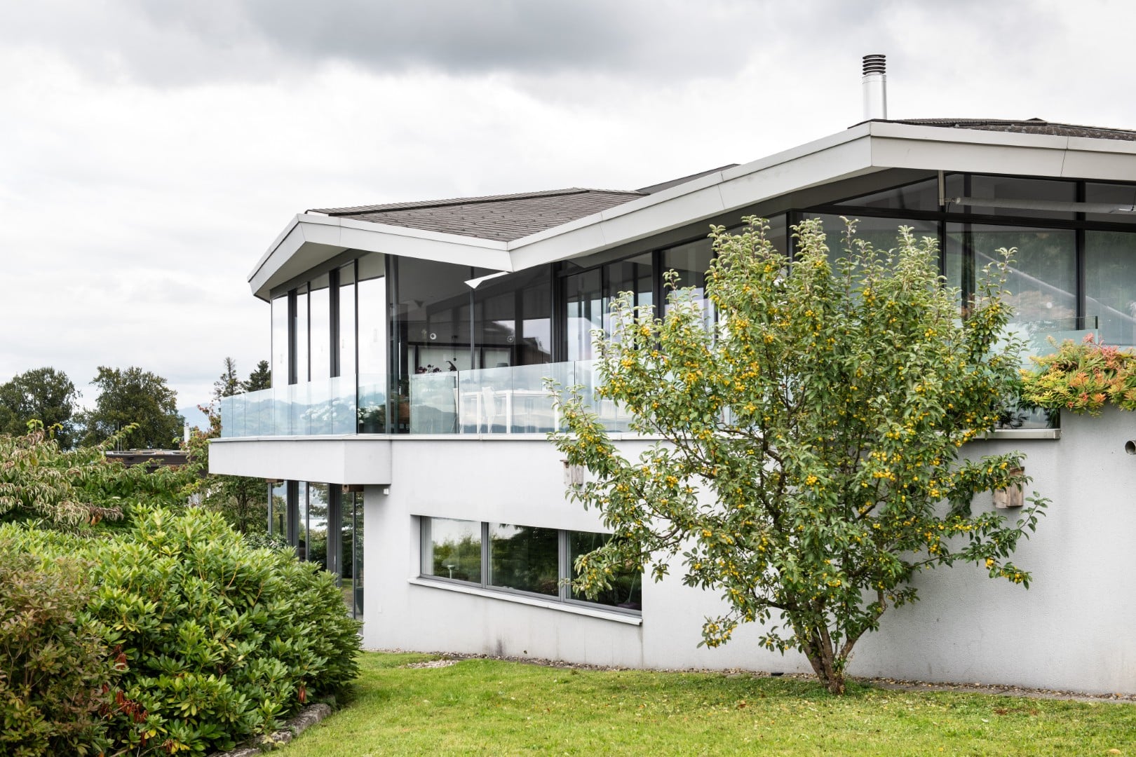 Eingebettet in die Landschaft, umgeben von einem faszinierenden Garten steht das Einfamilienhaus über dem Zürichsee. Grosse filigrane Fenster ermöglichen den Blick in die Weite.